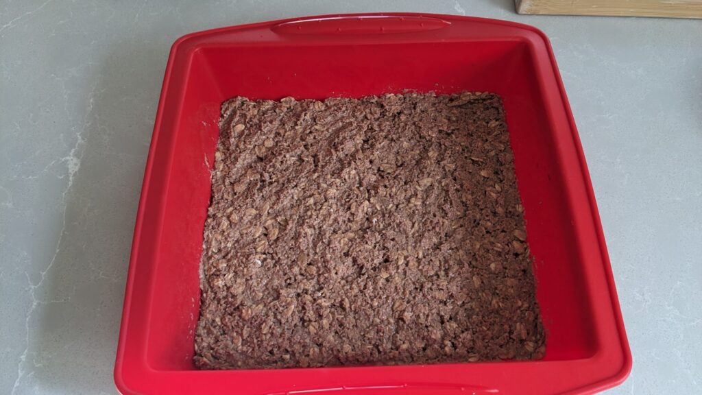 - Layer the Bars. Give the crust mixture one final stir. Press half of the dough into the bottom of your prepared pan. The mixture is heavy and dense, so it requires a little handling to spread it out into an even layer.